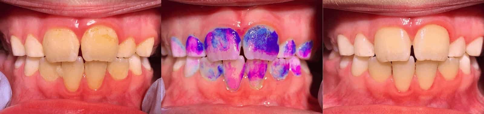 Before any cleaning, we use a safe, natural plaque-disclosing solution (a dye that highlights biofilm). This helps us see where buildup is hiding, evaluate your at-home brushing habits, and check your motivation for better hygiene. It guides us to target only the areas that need attention, making the cleaning more precise and less invasive. This step empowers you too—you can see the results and learn how to improve your daily routine for healthier teeth between visits.